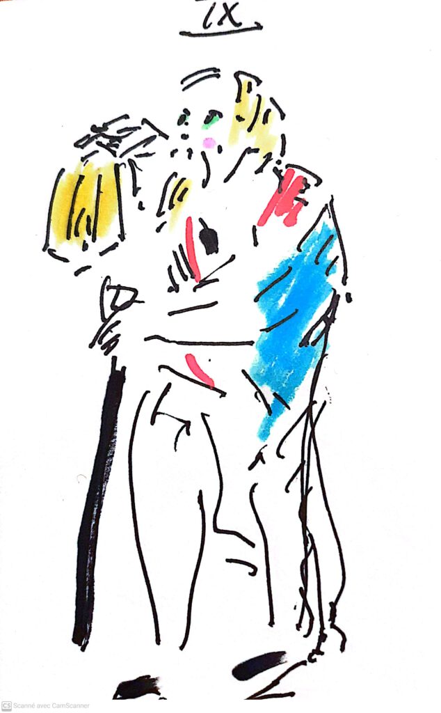 Un homme qui chemine dans la nuit sans doute il s’aide pour avancer d’un bâton. En main droite il tient une Lanterne.